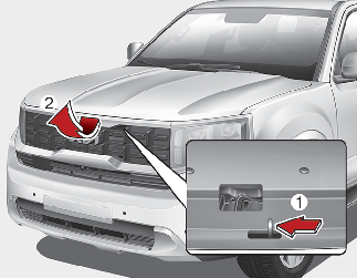차량의 앞에서 엔진 후드를 약간 들어 올리고, 중앙에 위치한 잠금레버(1)를 위로 당긴 상태에서 후드(2)를 위로 들어 올리십시오.