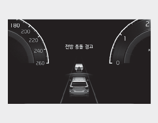 스마트 크루즈 컨트롤 작동 중에 전방 차량과의 충돌 위험이 높을 경우 경고문과 경고음을 통해 전방 충돌 경고를 알립니다. 즉시 전방 도로 상황 및 주행 상태를 확인하고 필요하면 브레이크 페달을 밟아 직접 속도를 조절하십시오.