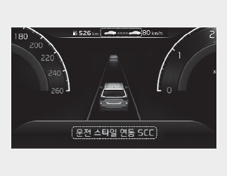 운전 스타일 연동이 작동하면 계기판에 ‘운전 스타일 연동 SCC’ 문구가 4초 동안 표시되고, 운전자의 주행 성향이 반영된 차간거리 단계 및 목표 차간거리가 표시됩니다.