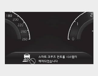 스마트 크루즈 컨트롤이 해제되면 전방 차량과의 간격이 유지되지 않습니다. 전방 도로 상황 및 주행 상태를 확인하고 필요하면 브레이크 페달을 밟아 차량 속도를 직접 조절하십시오.