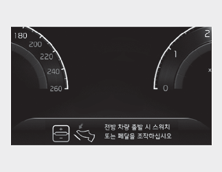 스마트 크루즈 컨트롤 작동 중에는 전방 차량이 정차하면 따라서 정차합니다. 일정 시간 내에 전방 차량이 출발하면 자동으로 출발합니다. 정차 후 일정 시간이 지나면 계기판에 위 그림과 같이 안내문이 표시됩니다. 다시 출발하려면