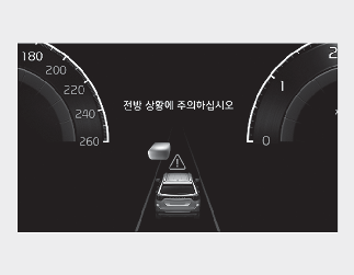 전방 상황 주의 알림이 발생하면 새롭게 나타난 전방의 차량이나 물체와 충돌할 수 있습니다. 전방 도로 상황 및 주행 상태를 확인하고 필요하면 브레이크 페달을 밟아 직접 속도를 조절하십시오.
