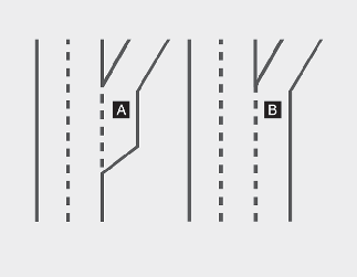 내비게이션에서 분기 형태의 진출입로로 경로를 안내하고 마지막 차로로 주행하는 경우, 진출입로 진입 전에 자동으로 감속합니다. 분리 형태의 진출입로라면 진입 전에 자동으로 감속하지 않습니다.