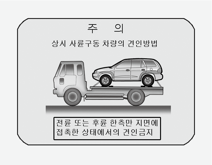 상시 4륜구동 차량은 보통의 견인 트럭으로 견인할 수 없습니다. 반드시 4륜을 들어올려 견인하십시오.