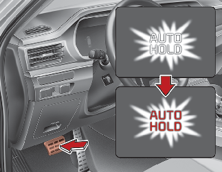 초록색 「AUTO HOLD」 표시등은 꺼지고 자동 정차 기능(Auto Hold)은 해제됩니다.전방에 차량이 가까이 있거나 내리막길 정차 후 출발할 때는 안전을 위해 이 방법을 사용하십시오.