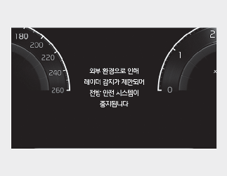 )이 켜지지만, 전방 충돌방지 보조 고장이 아닙니다. 이물질을 제거하면 전방 충돌방지 보조는 다시 정상적으로 작동합니다. 항상 깨끗하게 유지하십시오. 차량 후방 짐칸, 기타 장비(사양 적용시) 또는 이물질을 제거해도 전방