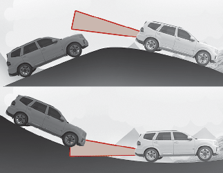오르막길이나 내리막길에서는 옆 차로에 있는 차량을 인식하지 못해 후측방 충돌방지 보조가 정상적으로 작동하지 않을 수 있습니다.
