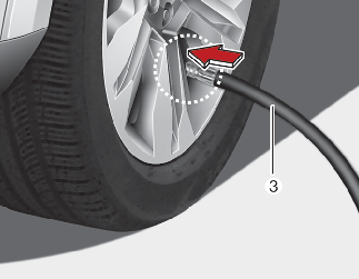 손상된 타이어의 휠 공기 주입구 캡을 풀어 「실런트 주입 호스」(3)를 휠 공기 주입구에 연결하여 고정하십시오.