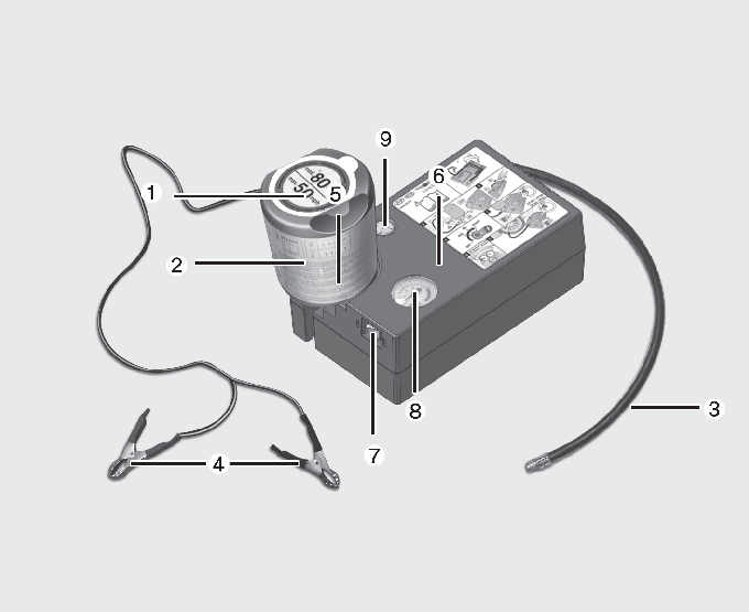 타이어 규정 공기압에 도달하면 컴프레서 스위치(7)를 끄십시오.