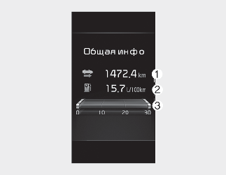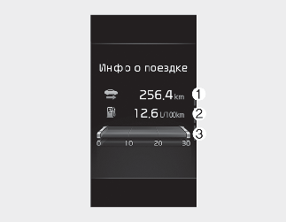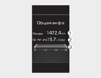 На дисплее отображается пройденное расстояние (1), средняя эффективность использования топлива (2) и мгновенный расход топлива (3) один раз в течение каждого цикла включения зажигания.