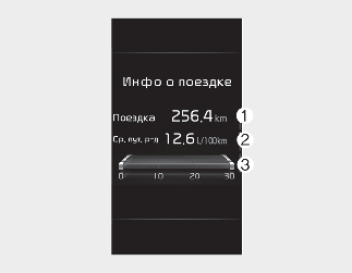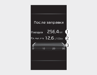 На дисплее отображается общее пройденное расстояние (1), средняя эффективность использования топлива (2) и мгновенный расход топлива (3) после дозаправки.