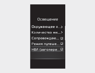Можно включить или отключить функцию, выбрав при включенном двигателе «Пользовательские настройки (ЖК-дисплей)» или «Настройки» → «Автомобиль (Экран информационно-развлекательной системы)» → «Lights» (Освещение) → «HBA (High Beam Assist)» (Дальний свет) на панели ЖК-дисплея или в меню настроек на экране информационно-развлекательной системы. Настройки сохранятся даже при остановке и повторном запуске двигателя.