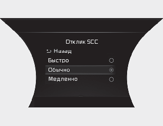 Можно отрегулировать чувствительность скорости автомобиля для соблюдения заданной дистанции до впереди идущего транспортного средства. В меню «Пользовательские настройки (ЖК-дисплей)» или «Настройки» выберите «Автомобиль (Экран информационно-развлекательной системы)» → «Помощь водителю» → «SCC Reaction» (Отклик SCC) → «Fast/Normal/Slow» (Быстрый/Обычный/Медленный). Можно выбрать один из трех режимов.