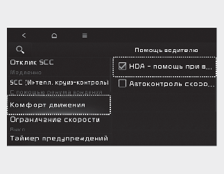 В меню «Пользовательские настройки (ЖК-дисплей)» или «Настройки» → «Автомобиль (Экран информационно-развлекательной системы)» выберите «Помощь водителю» → «Driving Convenience» (Комфортное вождение) → «Auto Highway Speed Control (LCD display)» (Автоуправление скоростью на магистрали (ЖК-дисплей)) или «Highway Auto Speed Change (Infotainment System screen)» (Автоизменение скорости на магистрали (Экран информационно-развлекательной системы)), чтобы включить систему интеллектуального круиз-контроля на основе данных навигации, и отмените выбор для ее отключения.