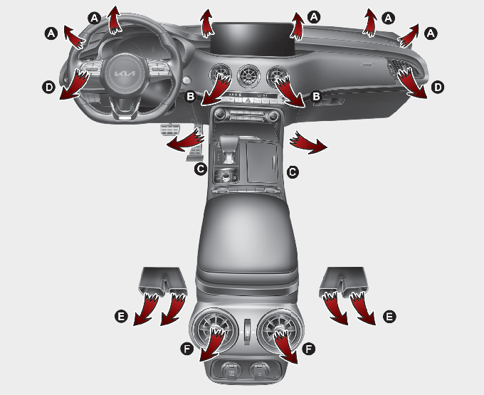 El aire que fluye por los difusores de salida de la 2.ª fila se controla con el sistema de control del climatizador delantero y se lleva a través de los conductos interiores del aire en el suelo (E, F).