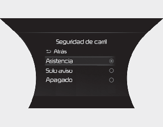 Si «Solo aviso» está seleccionado, la asistencia de mantenimiento de carril avisará al conductor con un sonido de advertencia cuando se detecte la salida de carril. El conductor debe maniobrar la dirección del vehículo.