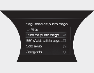 Si cambia el ajuste de "Desactivado" a "Solo aviso", el testigo de advertencia del espejo retrovisor exterior parpadeará durante tres segundos.