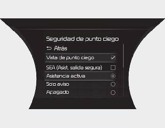 El ajuste de tiempo de aviso y volumen del aviso se aplica a todas las funciones de la asistencia de prevención de colisión en punto ciego.