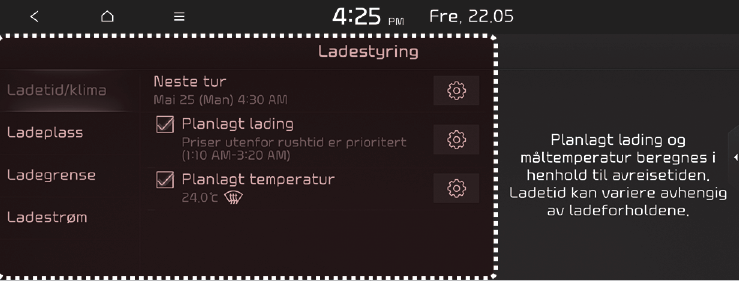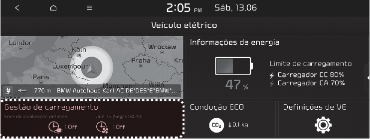 Pode definir a data e a hora para carregar a bateria, a temperatura de controlo da climatização, opções de carregamento com base na localização do veículo e outras funções.
