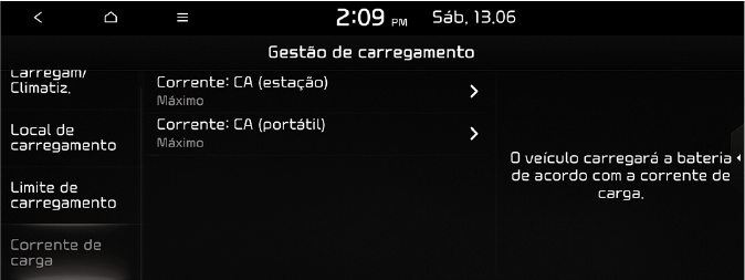 Pode ajustar a corrente de carregamento para um carregador CA. Selecione uma corrente de carregamento apropriada para o carregador utilizado.