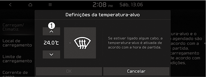 Selecione “EV → Charge management (Gestão de carregamento) → Reserved charging and Climate Control (Carregamento condicionado e controlo da climatização) → Reserved climate control (Climatização condicionada)” → definições de temperatura alvo no ecrã.