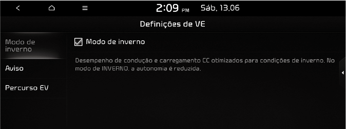 O modo de inverno é eficiente durante o inverno, quando a temperatura da bateria de alta tensão é baixa. Este modo é recomendado para melhorar o desempenho de condução e de carregamento CC durante o inverno ao aumentar a temperatura da bateria para um nível adequado. No entanto, pode reduzir significativamente a distância a vazio, uma vez que a bateria de alta tensão consome muito mais eletricidade.
