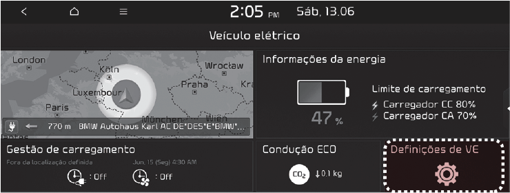 Pode aplicar funções elétricas do veículo para orientar a rota. Deste modo, poderá verificar a distância que pode percorrer com a quantidade atual de bateria. São apresentadas no ecrã as secções por onde pode e por onde não pode viajar no percurso para o seu destino. Também é apresentado o ícone de pesquisa de estações para que consiga encontrar estações próximas de imediato.