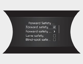 Segurança frontal: Consoante os níveis de risco de colisão, irá soar um aviso sonoro e a travagem será assistida. Se o seguinte menu estiver desativado, a Assistência à prevenção de colisão frontal será desligada e a luz de aviso (