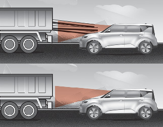 Se o veículo à sua frente tiver uma carga que se projeta para trás a partir da cabina, ou quando o veículo à sua frente tem uma maior distância ao solo, é necessária especial atenção. A Assistência à prevenção de colisão frontal poderá não ser capaz de detetar a carga que sai do veículo. Nestes casos, deverá manter uma distância de travagem segura relativamente ao objeto com a posição mais recuada e, caso seja necessário, manobrar o veículo e carregar no pedal do travão para reduzir a velocidade de condução, de forma a manter a distância segura.