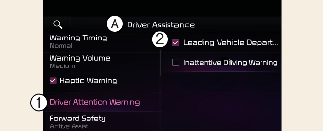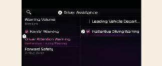 With the vehicle on, select or deselect Driver assistance → Driver Attention Warning from the Settings menu to set whether or not to use each function.