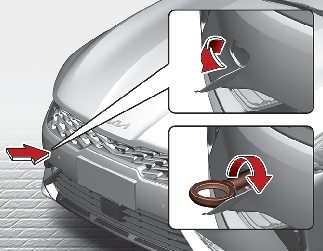 Install the towing hook by turning it clockwise into the hole until it is fully secured.