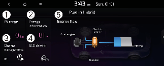 O menu Híbrido Plug-in é composto por cinco secções: [EV range (Autonomia Elétrica)], [Energy information (Informação Energética)], [Charge management (Gestão de carga)], [ECO driving (Condução ECO)], [Energy flow (Fluxo de energia)].
