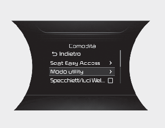 (Impostazioni utente) → Convenience (Comodità) → Utility Mode (Modalità Utility)" sul quadro strumenti.