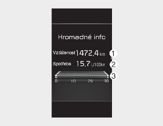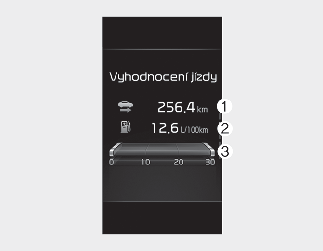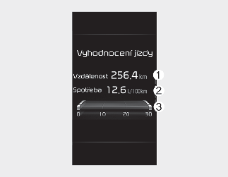 V tomto zobrazení jsou uvedené načítané denní kilometry (1), průměrná spotřeba paliva (2) a okamžitá spotřeba paliva (3).