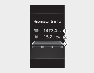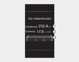 V tomto zobrazení jsou uvedené načítané denní kilometry (1), průměrná spotřeba paliva (2) a okamžitá spotřeba paliva (3) od posledního doplnění paliva.