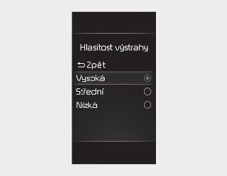 Pokud změníte nastavení hlasitosti výstrahy, může se změnit i hlasitost výstrah jiných asistenčních funkcí. Hlasitost výstrahy nastavujte až poté, co jste se s ní dostatečně seznámili.