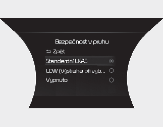 Je-li tlačítko ENGINE START/STOP (nastartování/vypnutí motoru) v poloze ON (Zapnuto), můžete výběrem jednotlivých voleb Driver Assistance (Jízdní asistenti) → Lane Safety (Bezpečná jízda v pruzích) v nabídce User Settings (Uživatelská nastavení) na LCD displeji nebo v nabídce Settings (Nastavení) → Vehicle (Vozidlo) na obrazovce informačního systému určit, zda má či nemá být používána určitá funkce.