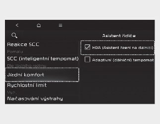 Driver Assistance (Jízdní asistenti) → Driving Convenience (Usnadnění řízení) → Auto Highway Speed Control (Automatické udržování rychlosti na dálnici) na LCD displeji nebo volbu Highway Auto Speed Change (Automatická změna rychlosti na dálnici) na obrazovce informačního systému v nabídce User Settings (Uživatelská nastavení) na LCD displeji nebo Settings (Nastavení) → Vehicle (Vozidlo) na obrazovce informačního systému, čímž zapnete funkci Adaptivní tempomat spolupracující s navigací; zrušením výběru volby funkci vypnete.