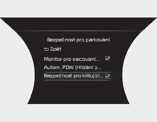 Součástí nastavení pro systém varování před projíždějícím vozidlem vzadu je funkce upozornění na projíždějící vozidlo při couvání a asistenční systém pro zabránění kolizi s projíždějícím vozidlem při couvání.