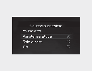 Con l’interruttore di accensione o il pulsante ENGINE START/STOP in posizione On, selezionare "Impostazioni → Assistenza conducente → Sicurezza anteriore" sul pannello di controllo oppure "Impostazioni → Veicolo → Assistenza conducente → Sicurezza anteriore" sul sistema di infotainment, per impostare se utilizzare ciascuna funzione.