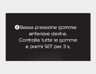 In seguito, se uno o più pneumatici sono notevolmente sottogonfiati, l'indicatore di bassa pressione dei pneumatici si accende e viene visualizzato un messaggio sul quadro strumenti.