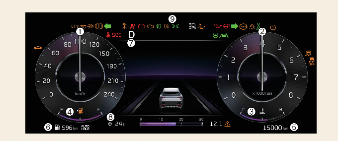 Pour le combiné de type LCD complet (type B), les informations sont affichées après avoir obtenu des informations d'un fournisseur d'informations météorologiques via le GPS. En fonction des conditions de réception du GPS, les informations peuvent différer du temps réel dans la zone où vous vous trouvez. Si aucune information n'est reçue via GPS (par exemple, vous n'êtes pas inscrit au service Kia Connect), les conditions météorologiques et l'heure s'affichent comme « soleil » et « nuit » sur le combiné d'instruments.