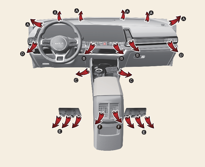 L'essentiel du flux d'air est dirigé vers le plancher, tandis qu'une petite partie est dirigée vers le pare-brise, les dégivreurs des vitres latérales et les aérations latérales. |