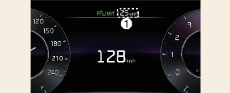 La limite de vitesse définie (1) s'affichera dans le combiné d'instruments. Si vous souhaitez dépasser la limite de vitesse prédéfinie, appuyez sur la pédale d'accélérateur au-delà du point de pression pour activer le kick-down.