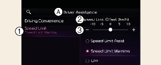 Véhicule allumé, lorsque Driver Assistance (Assistance du conducteur) → Speed Limit (Limite de vitesse) → Speed Limit Offset (décalage de limite de vitesse) est sélectionné, le décalage de limite de vitesse peut être modifié à partir du menu Réglages. L'avertissement de limite de vitesse et l'assistance de limite de vitesse fonctionnent en appliquant le réglage de décalage de limite de vitesse à la limite de vitesse détectée.