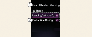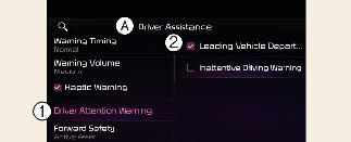 Si vous changez le délai d’avertissement, le moment de l'avertissement des autres systèmes d’assistance peut changer. Si le véhicule est redémarré, le délai d'avertissement d'avertissement d'attention du conducteur conservera le dernier réglage.