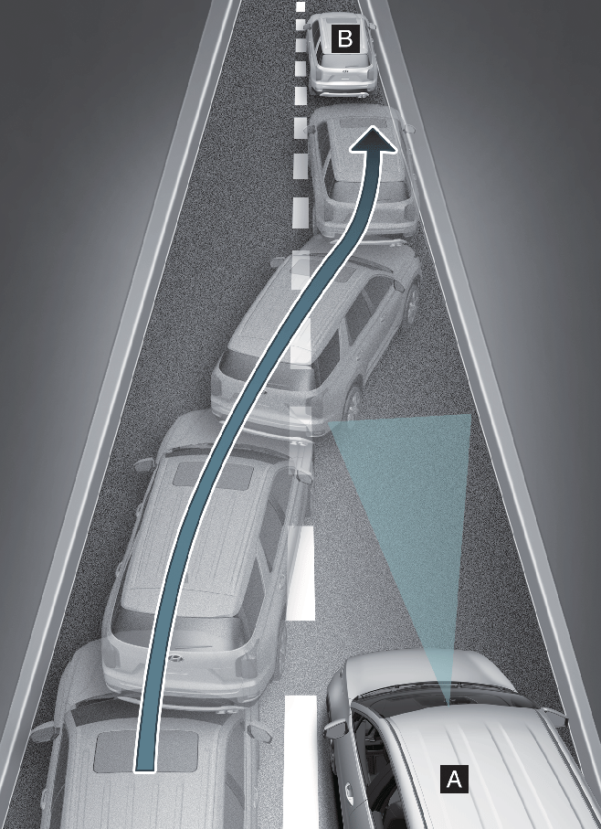 Lorsqu'un véhicule se rabat sur votre voie (B), il ne peut pas être détecté tant qu'il n'est pas dans la plage de détection du capteur de détection. L'assistance à l'évitement de collision avant risque de ne pas détecter immédiatement le véhicule lorsqu'il se rabat brusquement. Dans ce cas, vous devez conserver une distance de freinage appropriée et, si nécessaire, corriger le volant et appuyer sur la pédale de frein pour réduire la vitesse et garder une distance de sécurité.