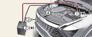 S’il est connecté à l’autre véhicule, démarrez d’abord le véhicule avec la batterie d’appoint et laissez-le tourner à 2 000 tr/min pendant plusieurs minutes.