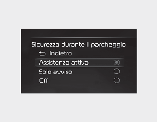 Con il pulsante Start/Stop del motore in posizione ON (Acceso), selezionare o deselezionare "Driver Assistance → Parking Safety" ("Assistenza conducente → Sicurezza durante il parcheggio") nel menu Impostazioni per stabilire se avvalersi o meno di ciascuna funzione.
