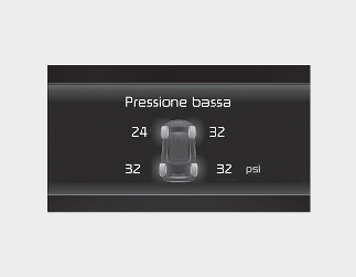 Quando gli indicatori spia del sistema di monitoraggio pressione pneumatici appaiono e viene visualizzato il messaggio spia sul display LCD quadro strumenti, vuol dire che uno o più pneumatici sono sotto-gonfiati in misura significativa. L'indicatore di pneumatico sgonfio segnala quale pneumatico è molto sgonfio accendendo la spia di posizione corrispondente.
